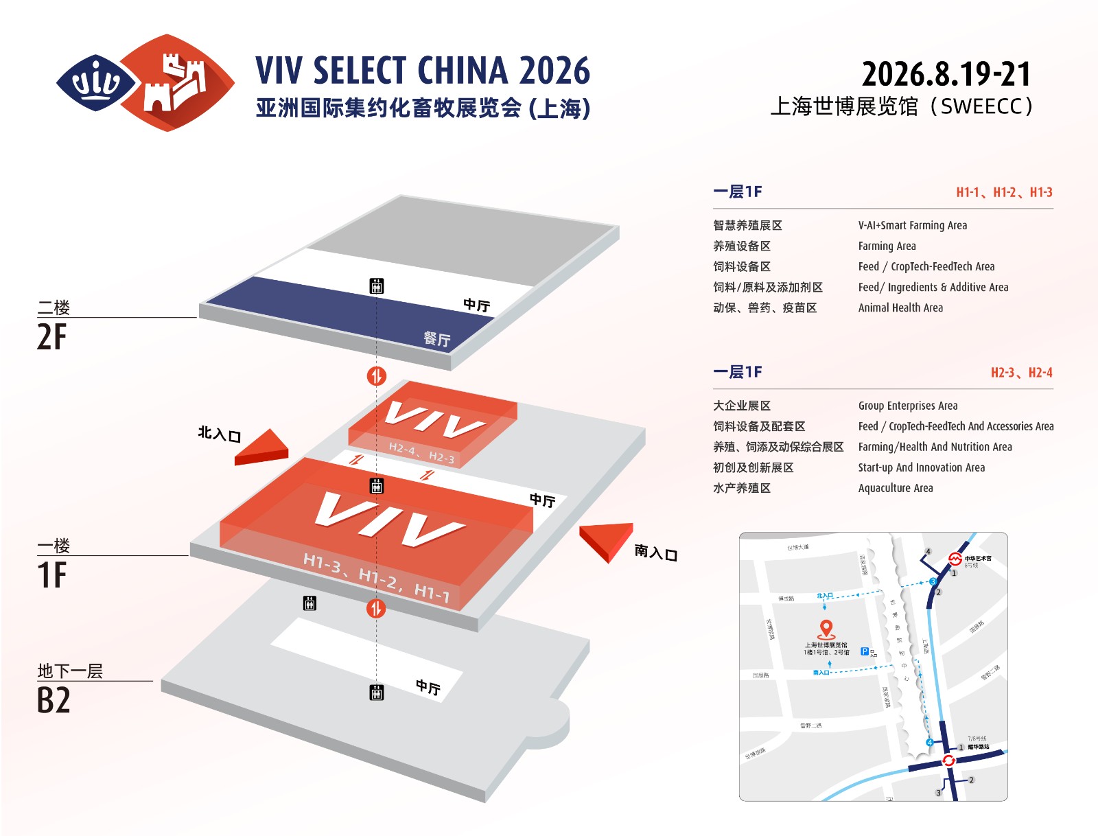 智慧养殖新体验-VIV智选专区丨家禽育种成果展区丨种猪基因技术展区丨动物福利养殖展区丨天然植物提取物专区丨饲料高效加工展区丨长三角低碳农牧展区丨智能工厂演示区丨V-Match跨国采购商贸洽谈区